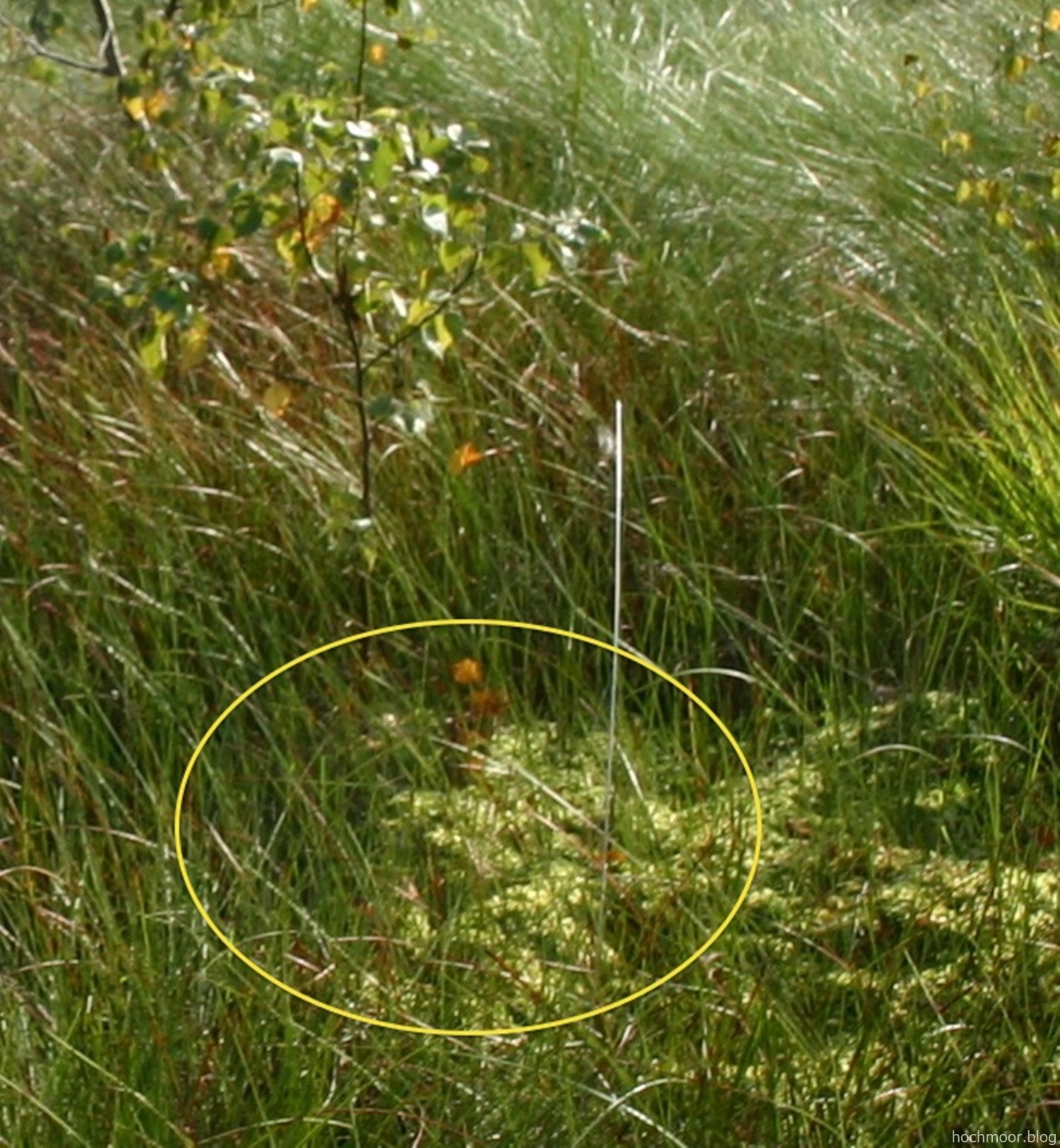 Die Birke ist gerade erst angewachsen, und das Bultmoos ist dabei, die Wollgräser zu verdrängen. Auf diese Zeit datieren wir den Wechsel der Vegetation von den Gefäßpflanzen des Niedermoores – ihre Reste zeigt die „Matsche“ in Günthers Hand auf dem Fotomosaik von vorher- zu den Moosen des Hochmoores.
