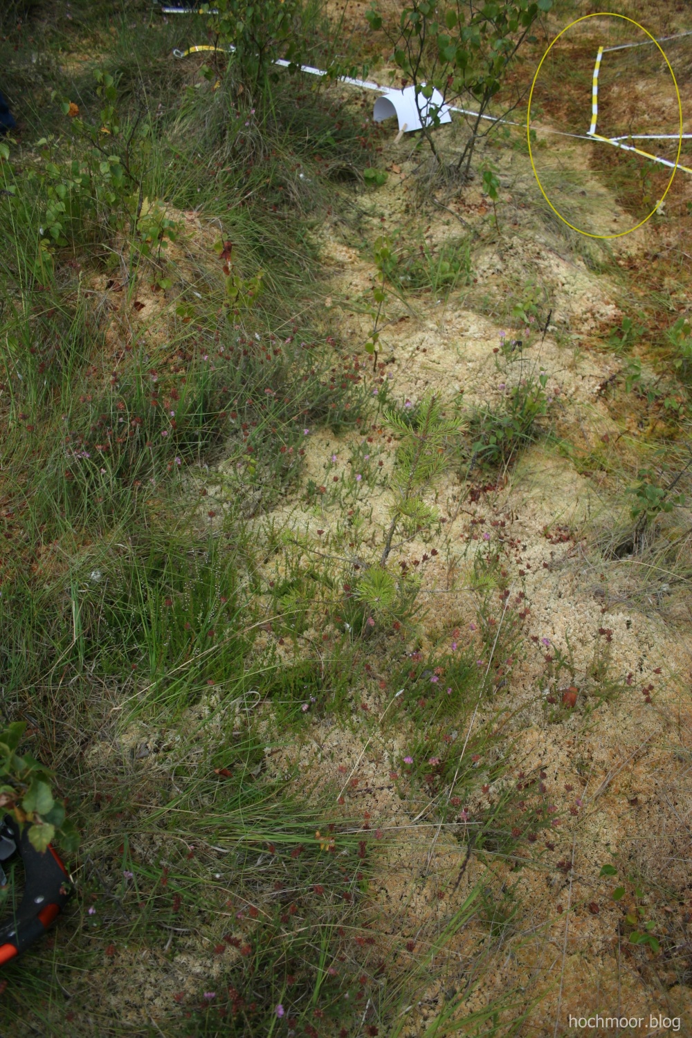 Das erneute Zusammentreffen lässt erwarten, dass Warzen-Moos und Glockenheide auch hier am Beet 4 auf eine dauerhafte Partnerschaft zu steuern. Die außergewöhnlich lange Trockenperiode mag somit paradoxerweise die Pioniere einer Pflanzen-Gesellschaft zusammen führen, die als typisch für feuchtes Küsten-Klima an Nord- und Ostsee bekannt ist. Ein kompletter Artenwechsel binnen Jahresfrist ist nach unseren Beobachtungen ungewöhnlich, und die Umstände dieses Habitat-Wandels vermitteln uns einen Eindruck von der Flexibilität, mit der ein Bult-Moos wie S. papillosum extremen Wetterlagen zu begegnen vermag.