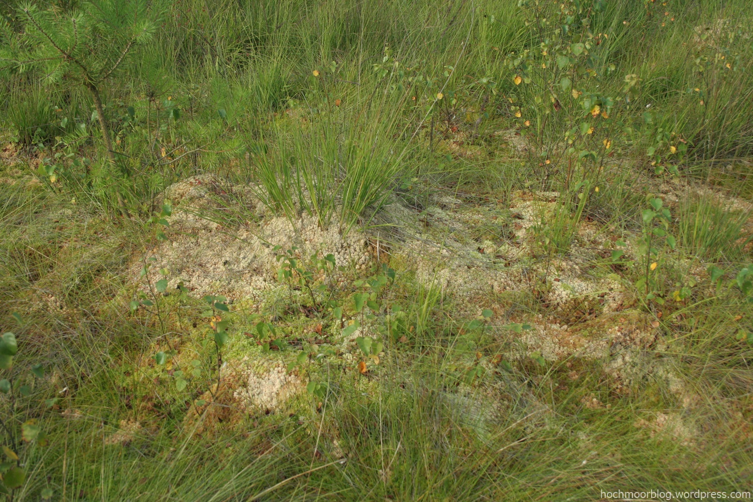 Albedo im Bult von Sph. papillosum. Stärker vergrößert zeigt die Bildecke (unten links) den Anstieg der Sphagnenarten von S. cuspidatum, – fallax, -palustre (semmelbraun) bis -papillosum (albedoweiss)