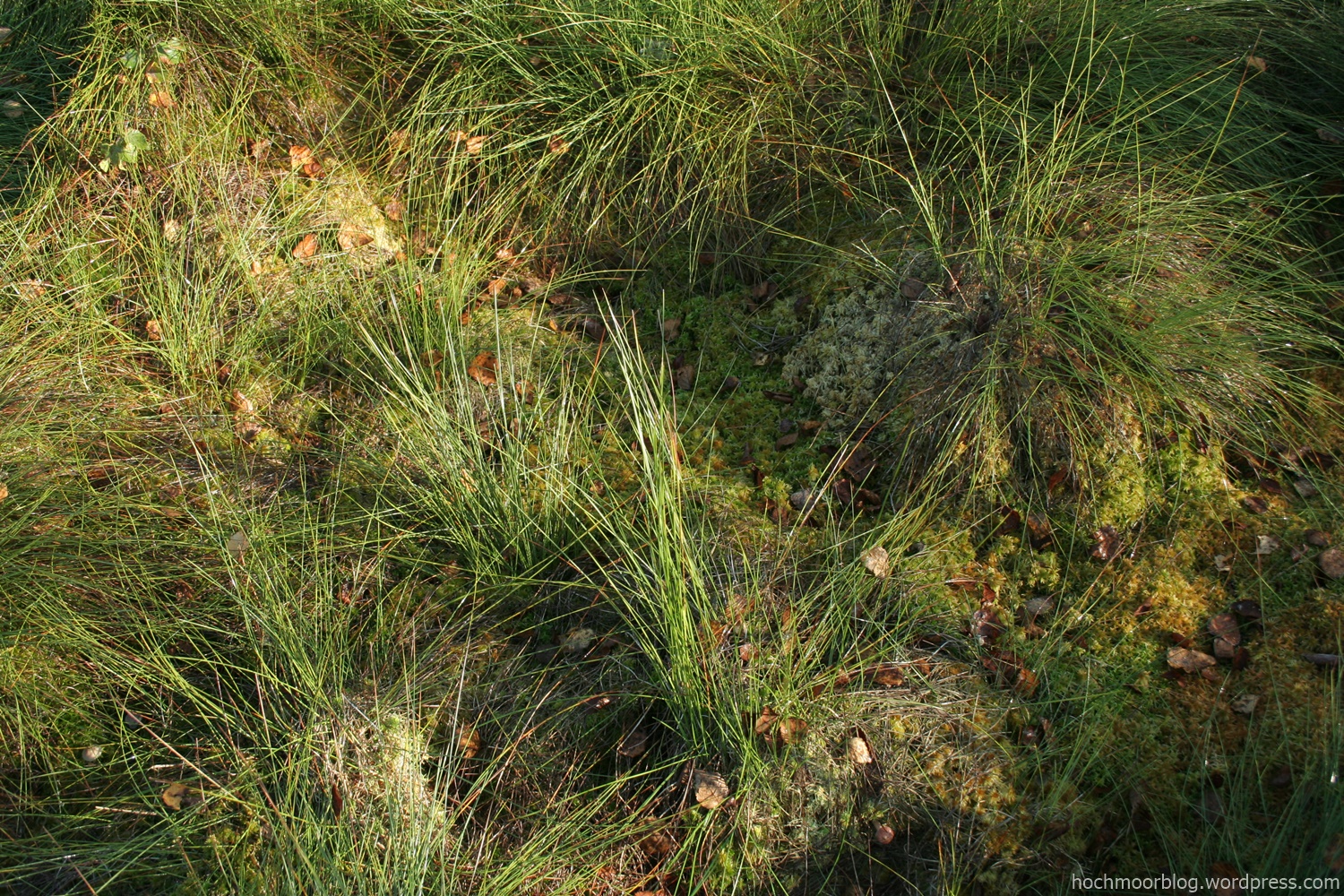Im Rasenhorizont ist Pfeifengras noch nicht wieder zurück gekehrt; vom Dornfarn des Vorjahres ist (mit Klick auf Originalgröße/drüben rechts) im untersten der Wollgrashorste nur noch ein vertrockneter Wedel zu erahnen