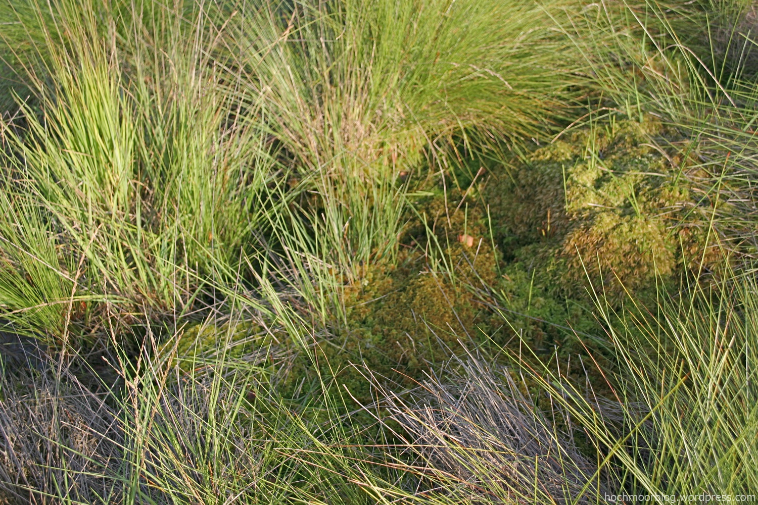 Drei Jahre nach dem Bultstart teilen sich die vier Sphagnenarten den Aufstieg von Schlenke (links unten)zum Bult (rechts oben) zu etwa gleichen Anteilen